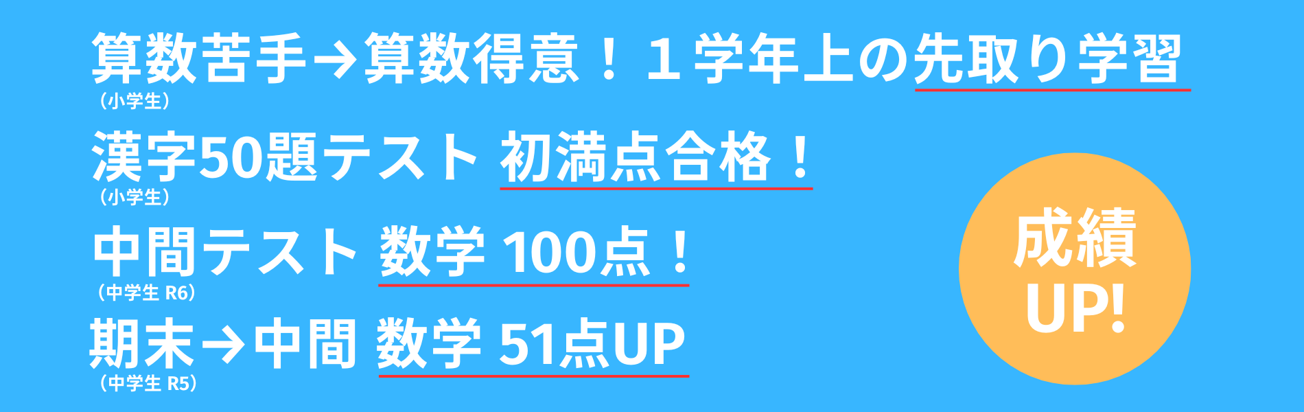 - 数学51点UP【中間テスト】佐野市内の中学校で中間テストがありました。 ある塾生は数学の点数が51点もUP。(中1二学期期末→中2一学期中間の約3ヶ月) 子どももわたしもとてもうれしい結果となりました。 「勉強が楽しい!」だから成績も上がる 51点 […]